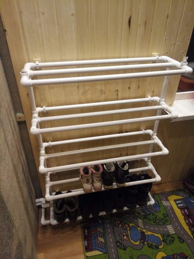 Автор данных фотографий живет в частном доме, в районе которого дороги и тротуары чистят довольно редко, и постоянно сталкивается с тем, что дети приходят домой в мокрой обуви. Так как мужчина работает сантехником, он нашел решение данной проблемы, соорудив необычную сушилку для обуви и подключив ее к системе отопления дома. Давайте посмотрим, что же получилось в итоге.
